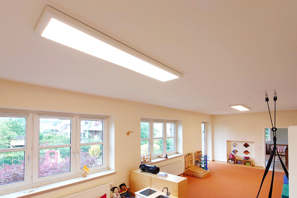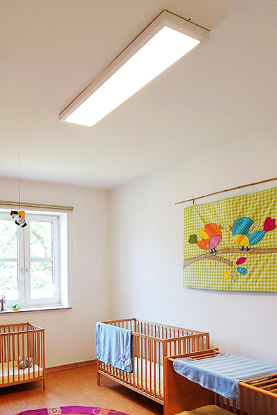 Die LED-Anbauleuchte für den Innenbereich ist so bemessen, dass sie vorhandene Bohrungen von nahezu allen gängigen Langfeldleuchten 2x 58W überdeckt. Das Gehäuse ist aus pulverbeschichtetem Stahl mit Kopfstücken aus Aluminiumdruckguss. Die Leuchte erfüllt mit ihrer effizienten Lichtstreuung und der Blendungsminimierung die Voraussetzung für eine Bildschirmarbeitsplatzbeleuchtung.