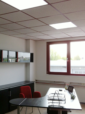 LED-Panel zum Einlegen in Moduldecken mit einem Rastermaß von 300 x1200 mm oder mit seperat erhältlichem Aufbaurahmen. Symmetrische, breitstrahlende Lichtverteilung, geringe Einbautiefe von 12 mm, Entblendung für Bildschirmarbeitsplätze, BAP, UGR<19.